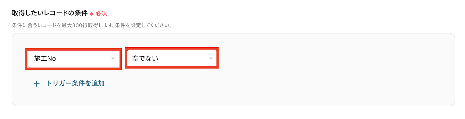 今回は、Google スプレッドシート(施工管理表)に入力されている全てのデータを取得したいので画像のように設定します。