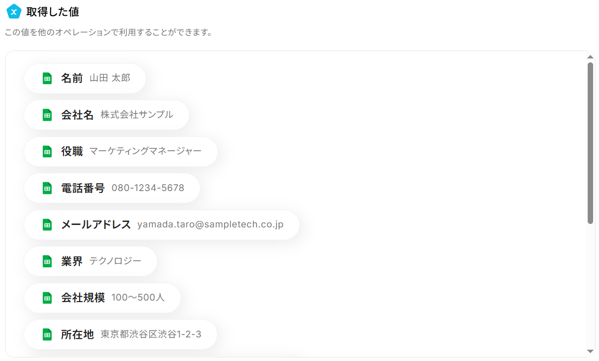 トリガーやオペレーション設定時に「テスト」を実行して取得した値のことです。 後続のオペレーション設定時の値として利用でき、フローボットを起動する度に変動した値となります。