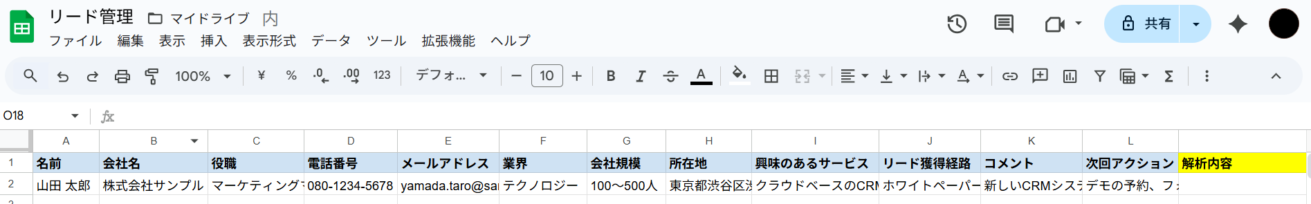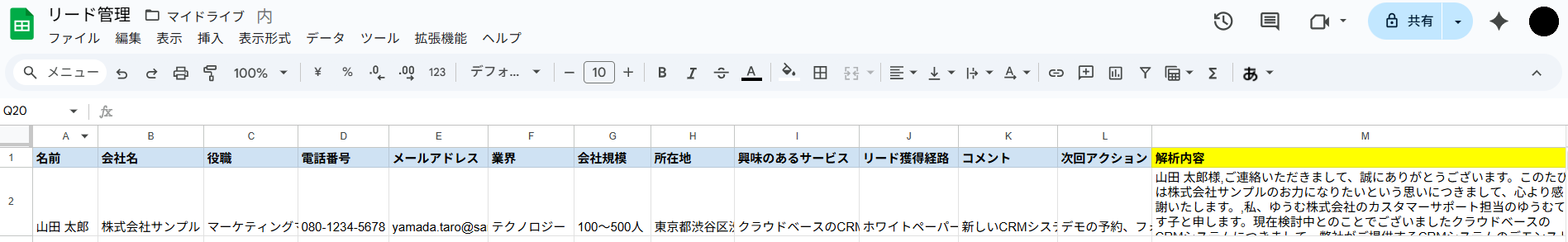はじめにテスト用のシートをご用意ください。 今回は例として、以下の情報をもとに提案メールを生成・送信後、M列の「解析内容」欄に生成内容を書き戻すという想定で進めていきます。 この際、必ず他の列とデータが重複しない一意の値が入った列 を作成しましょう。