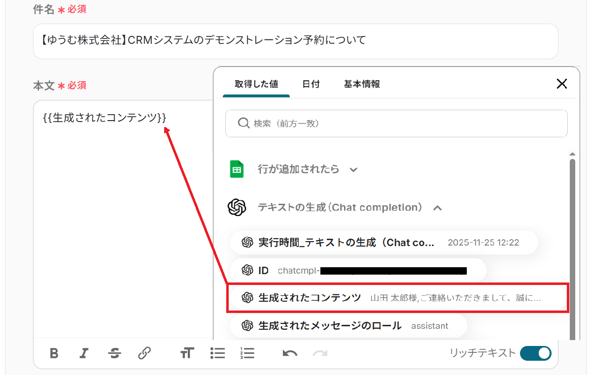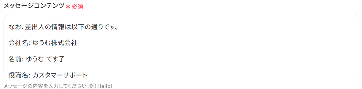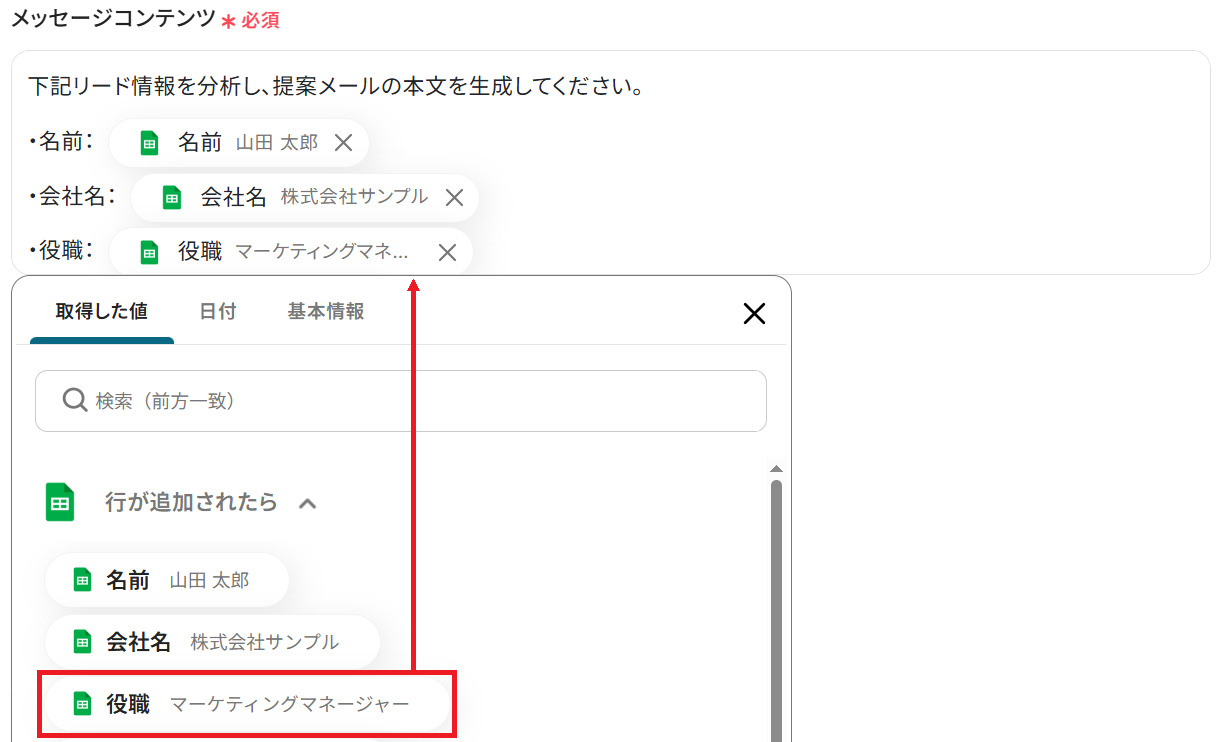 メッセージコンテンツを入力してください。 固定の文章やGoogle スプレッドシートから取得した値を組み合わせて、ご自身の業務に沿ったプロンプトを作成しましょう。 ※以下のように取得した値を設定することで、トリガーが実行されるたびに最新の情報を反映できます。