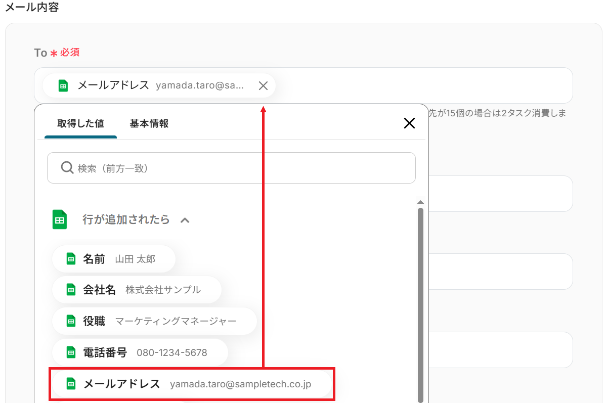 まず、ToにGoogle スプレッドシートから取得したメールアドレスの値を入力しましょう。 CC・BCCの設定もできます。