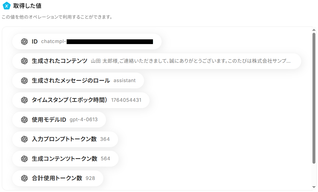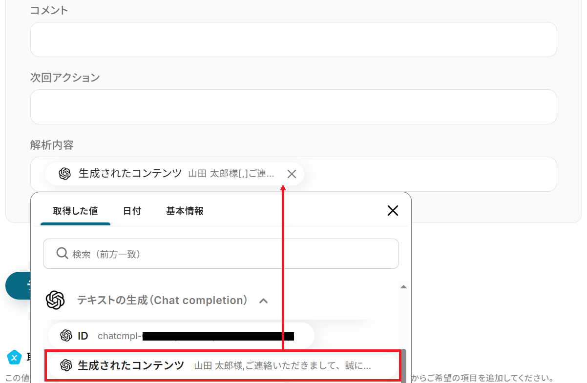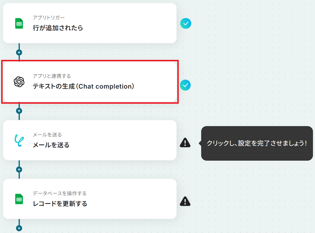 先ほど取得したレコード情報をもとに、OpenAIで提案メールを生成します。 「テキストの生成(Chat completion)」をクリックしましょう。