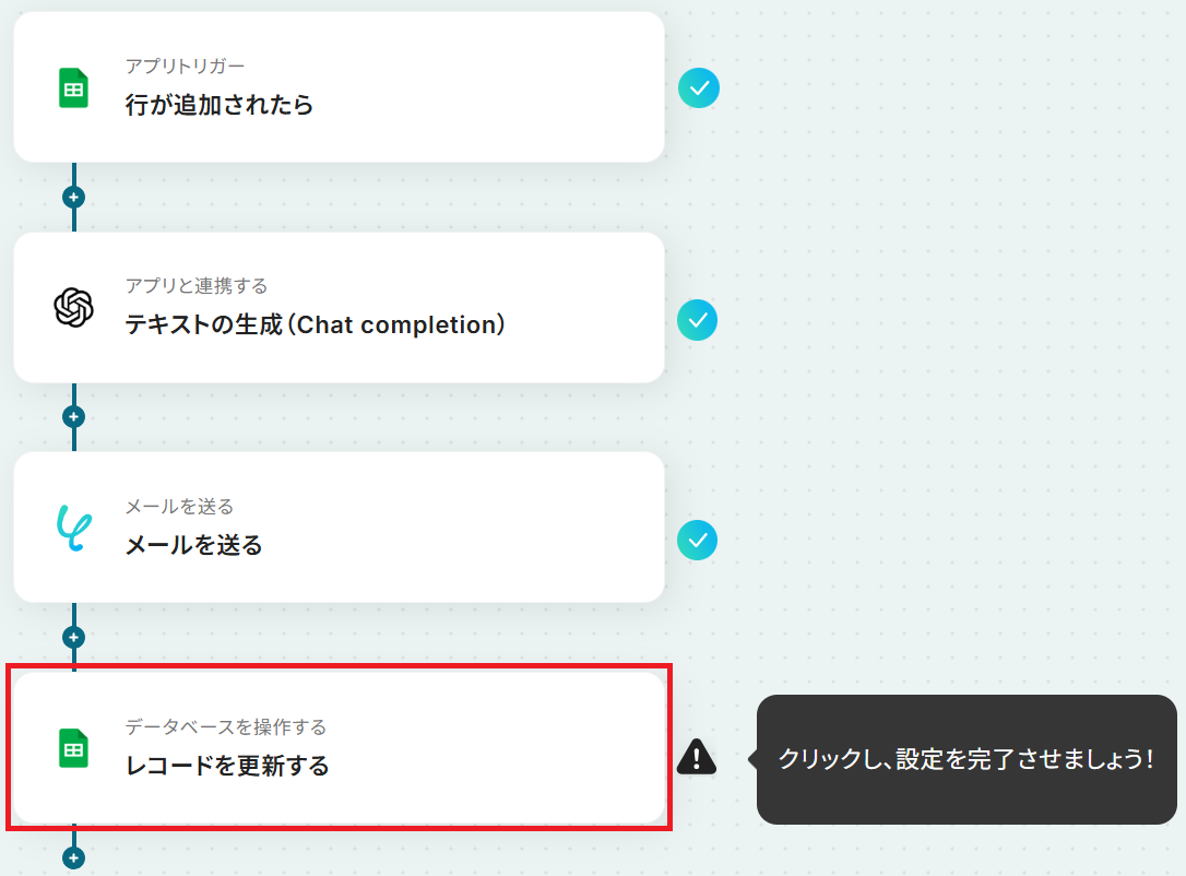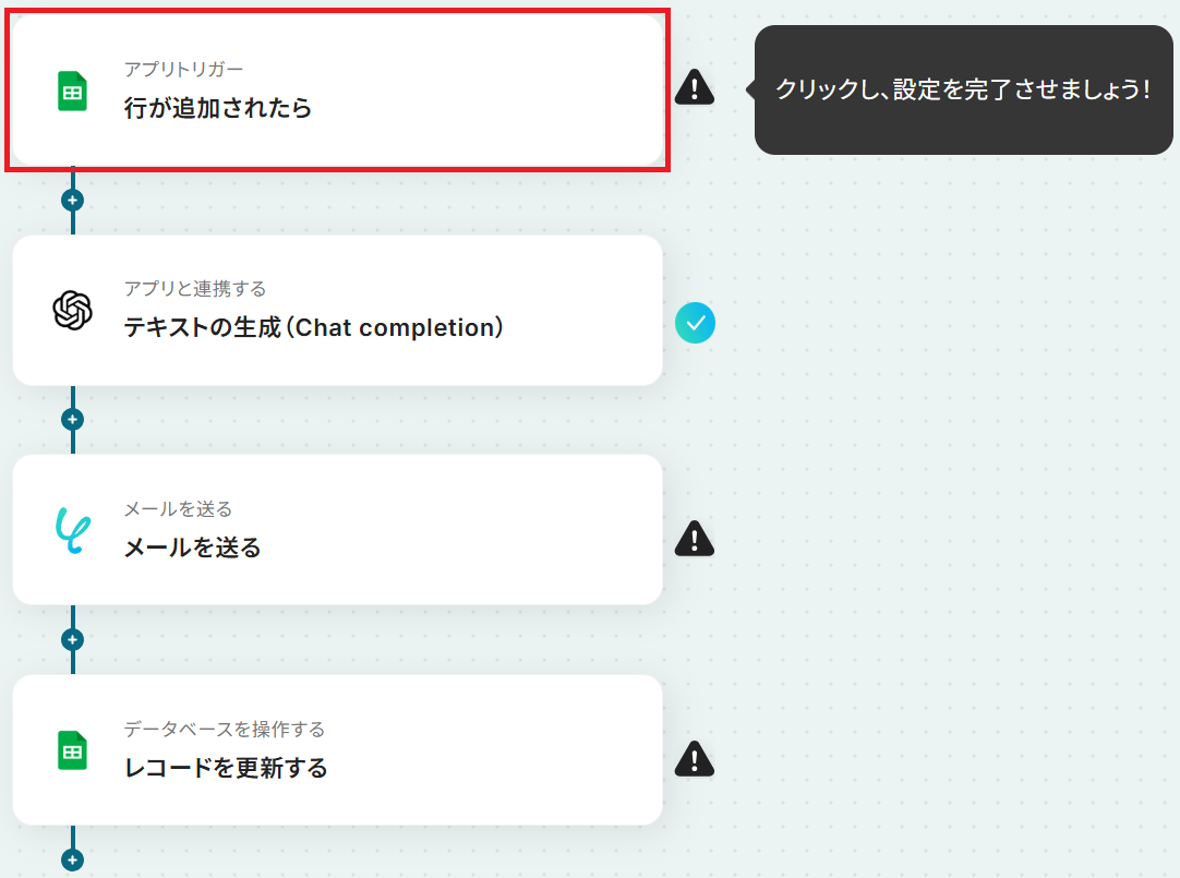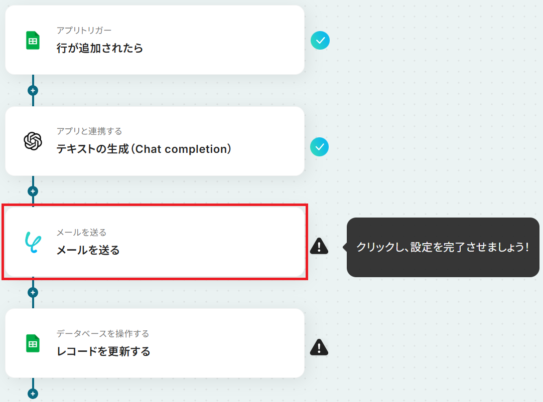 トリガーに設定するGoogle スプレッドシートでは、対象のスプレッドシート、シート、テーブル範囲などを任意に設定してください OpenAIのオペレーションでは、メール文面を生成するためのプロンプトを自由にカスタマイズでき、Google スプレッドシートから取得したリード情報を変数として利用することが可能です メール機能のオペレーションでは、宛先や件名、メッセージ内容などを設定し、OpenAIが生成したテキストなどを変数として活用できます 最後に設定するGoogle スプレッドシートのオペレーションでは、更新対象のスプレッドシート、シート、更新したいセルなどを任意に設定してください ■注意事項