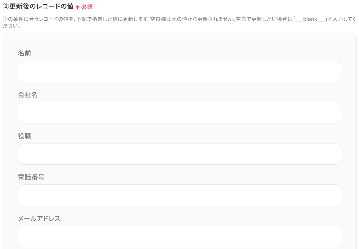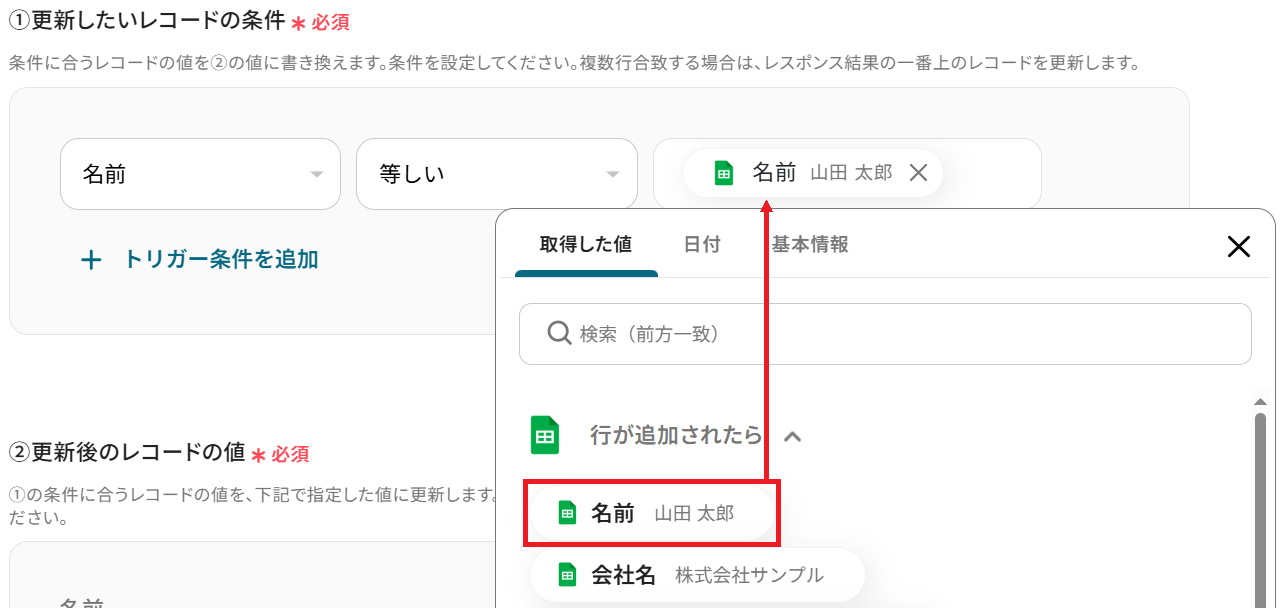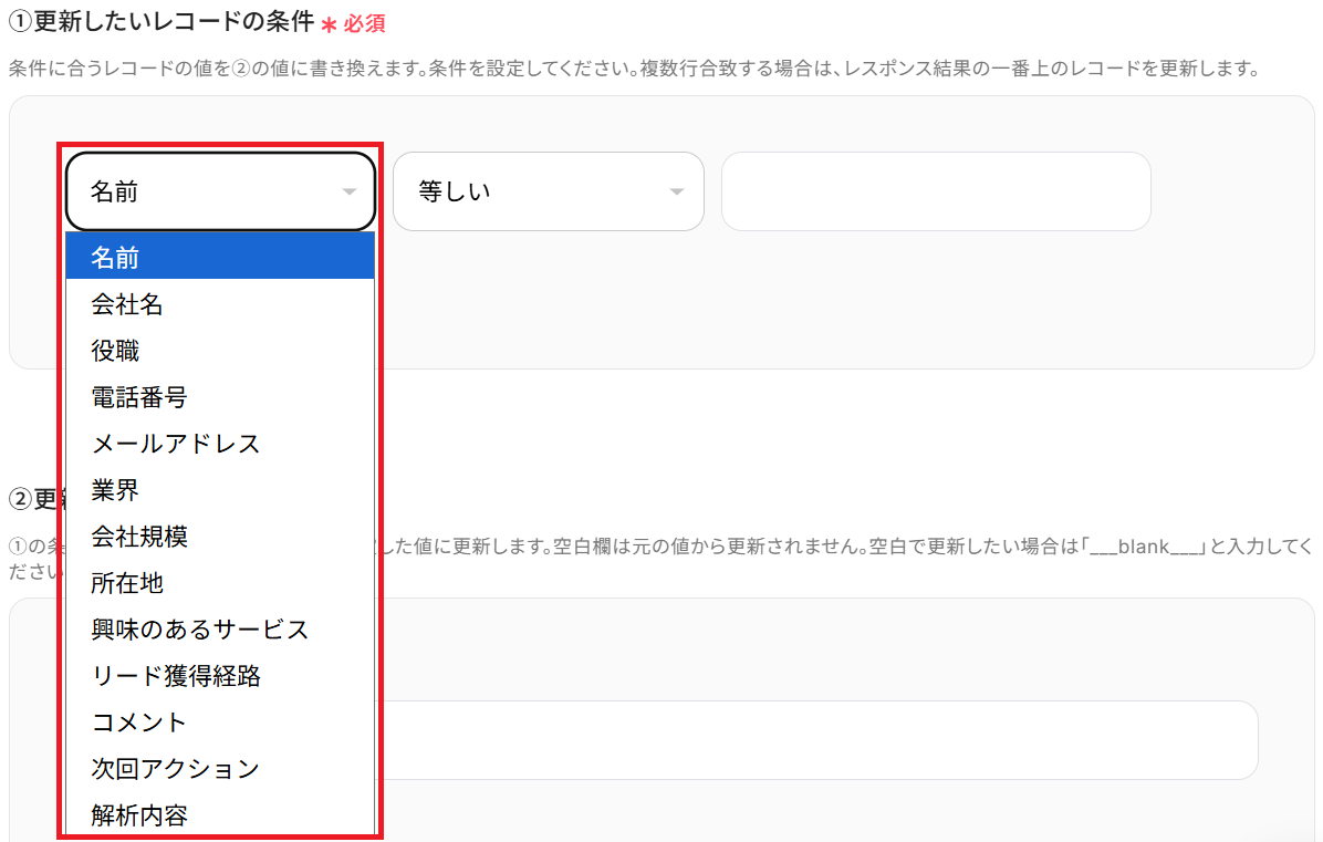 「①更新したいレコードの条件」の左の欄は用意したシートの項目名がプルダウンになっているので、一意の値が入っている項目を選択してください。 今回でいうとA列の「名前」です。