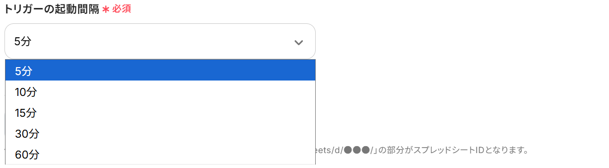 5分、10分、15分、30分、60分のいずれかで設定できます。ご利用プラン によって、設定できるトリガーの最短間隔が違うので、その点は要チェックです。 なお、基本的にはそのプランの最短の起動間隔にしてお使いいただくことをおすすめします。
