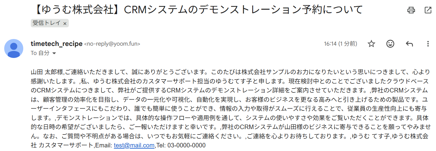 Google スプレッドシートの情報をもとに作成された提案メールが、Yoomのアドレスから送信されました!
