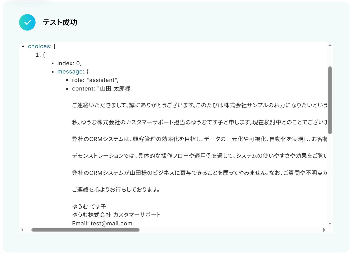 成功したら保存してください。 OpenAIが提案メールを生成してくれました!