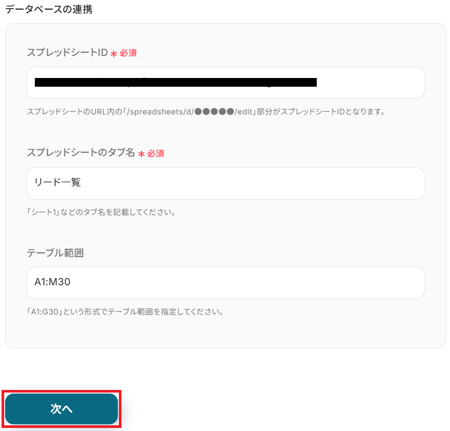 次に、ステップ3と同じ「スプレッドシートID」と「スプレッドシートのタブ名」を候補から選択します。 任意でテーブル範囲を選択して「次へ」をクリックしましょう。