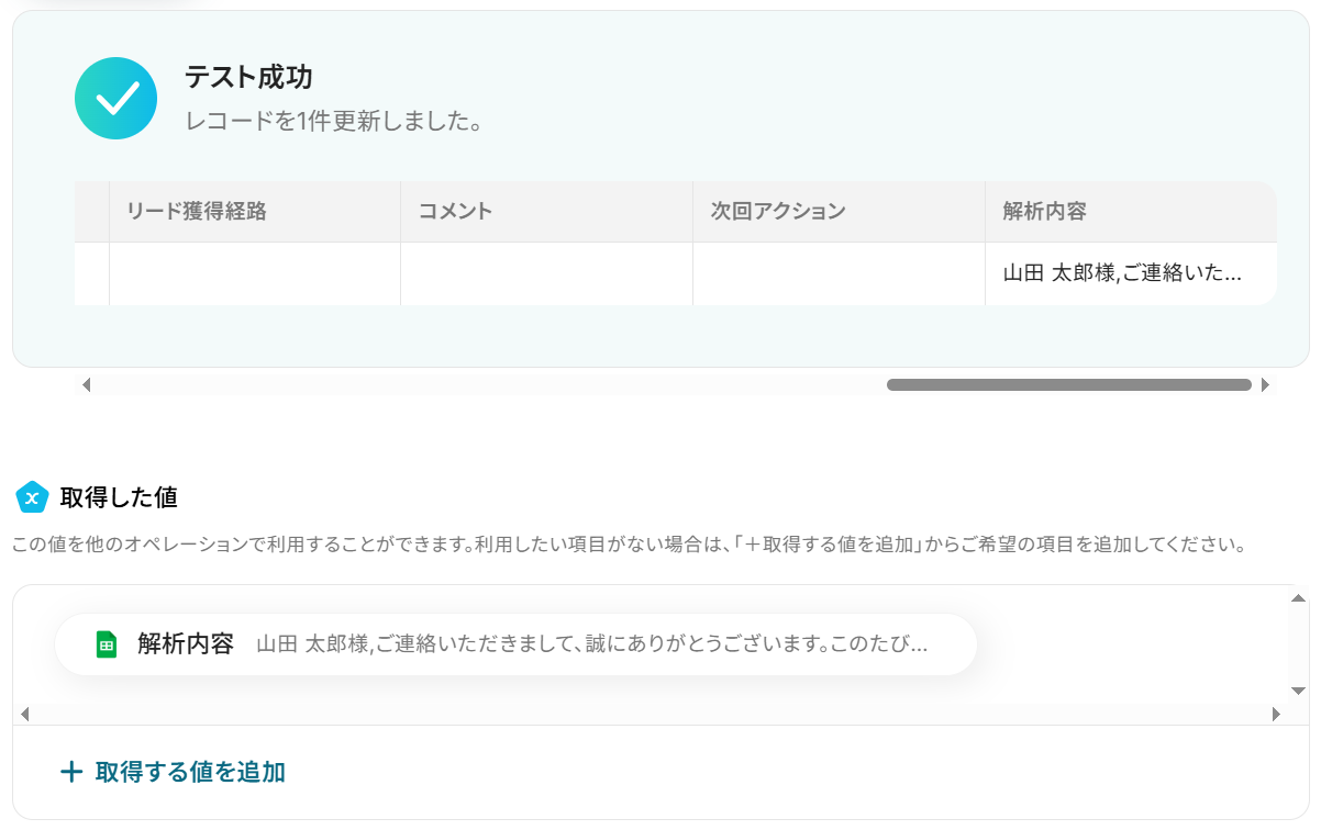 最後に「②更新後のレコードの値」の更新したい列の欄に、OpenAIの「生成されたコンテンツ」の値を設定してください。 今回でいうと用意したシートのM列にあたる「解析内容」欄です。