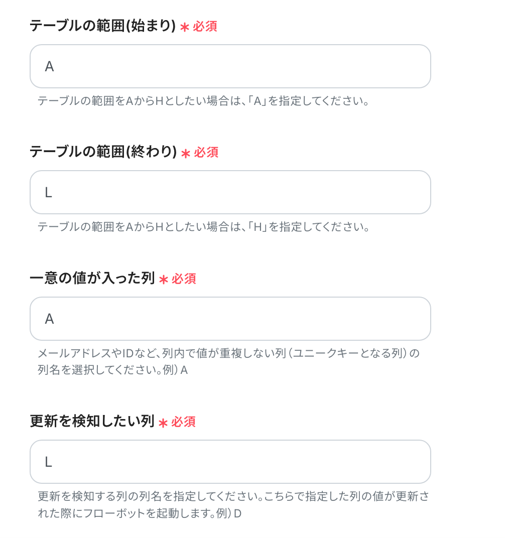 更新を検知する列の列 :ここで指定した列の値が更新された際にフローボットを起動。
