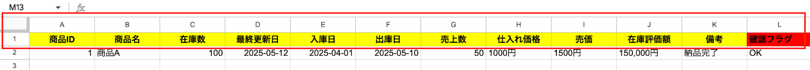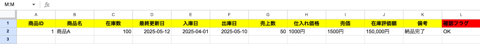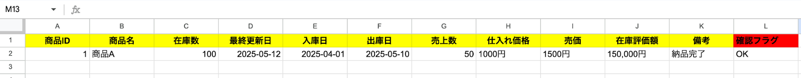 「テーブル範囲」は、Google スプレッドシートの対象となる範囲を英字で設定してください。 今回は以下のシートを使用するため、テーブル範囲は「A1:L」です。