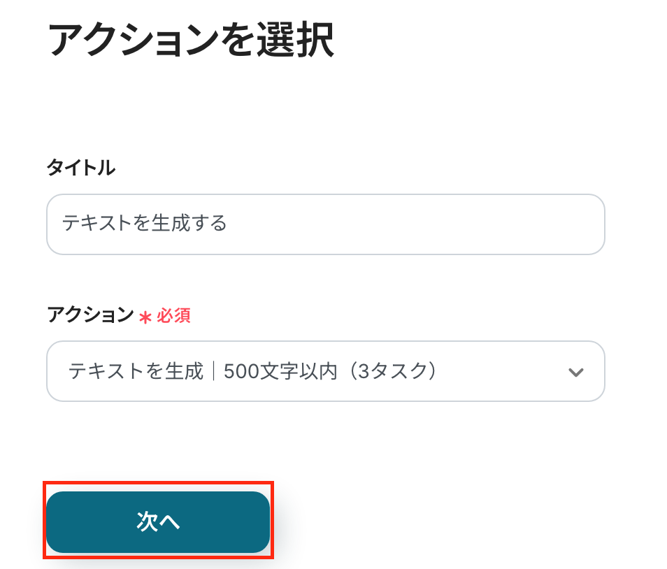 以下の画面で、タイトルを任意で修正し、連携するアカウントを確認します。 アクションをそのままにして、画面をスクロールダウンしましょう!