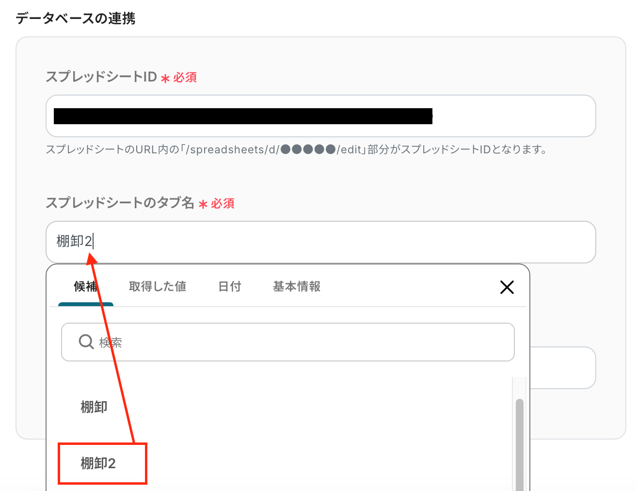 データベース連携の項目は、入力欄下の部分を参照して記入してください。 なお、スプレッドシートIDやタブ名はボックスをクリックして表示される候補から選択可能です。