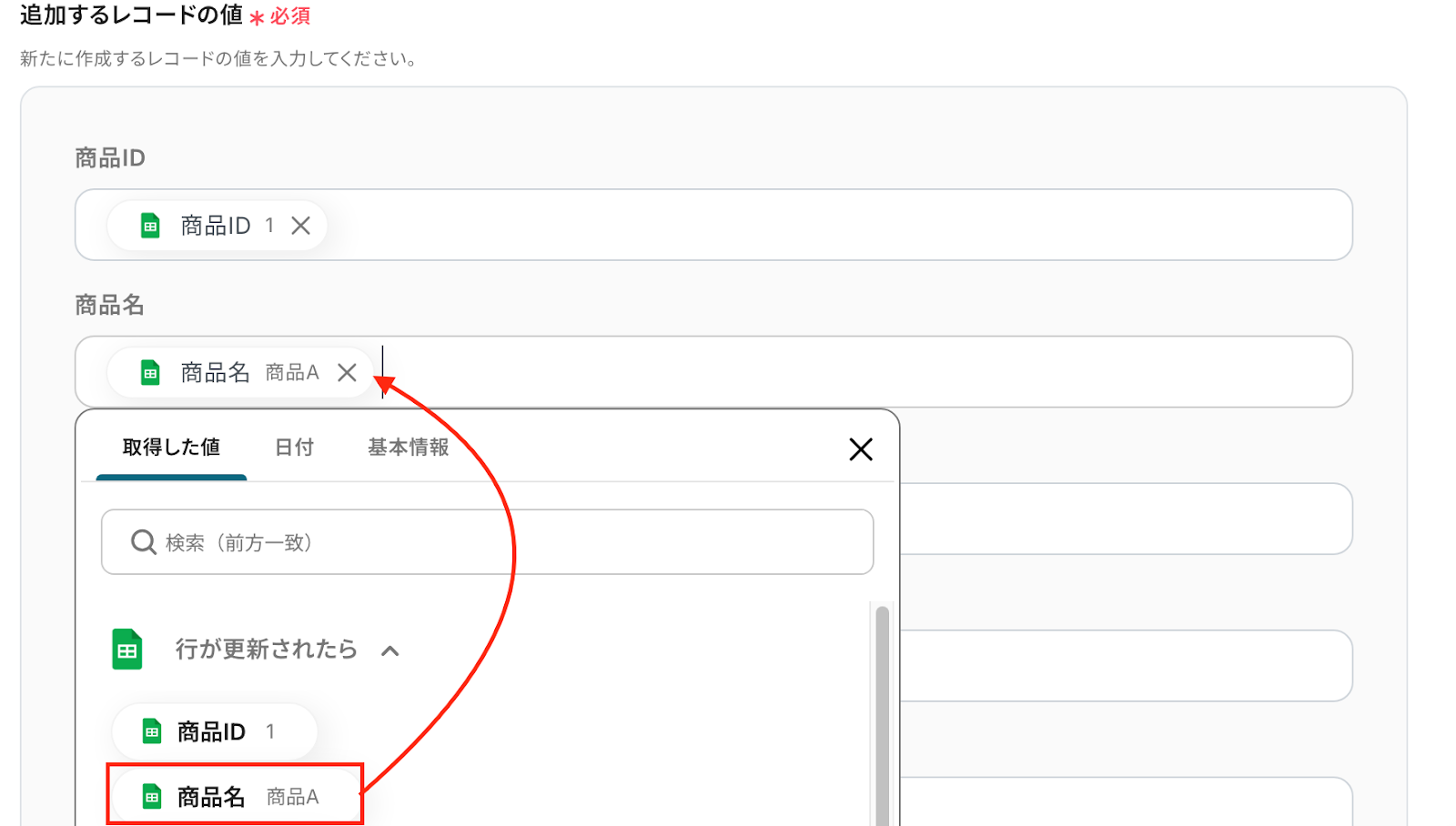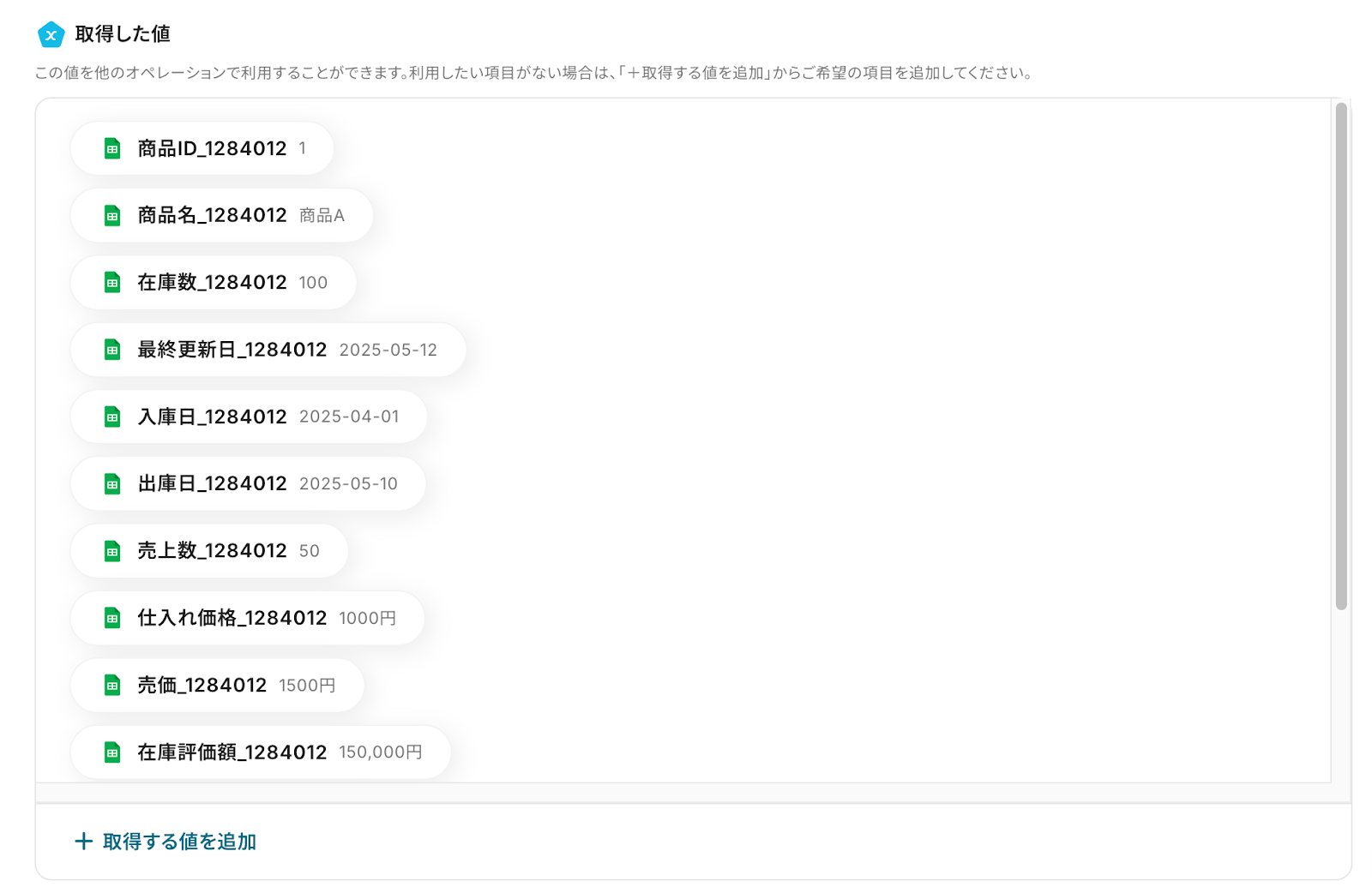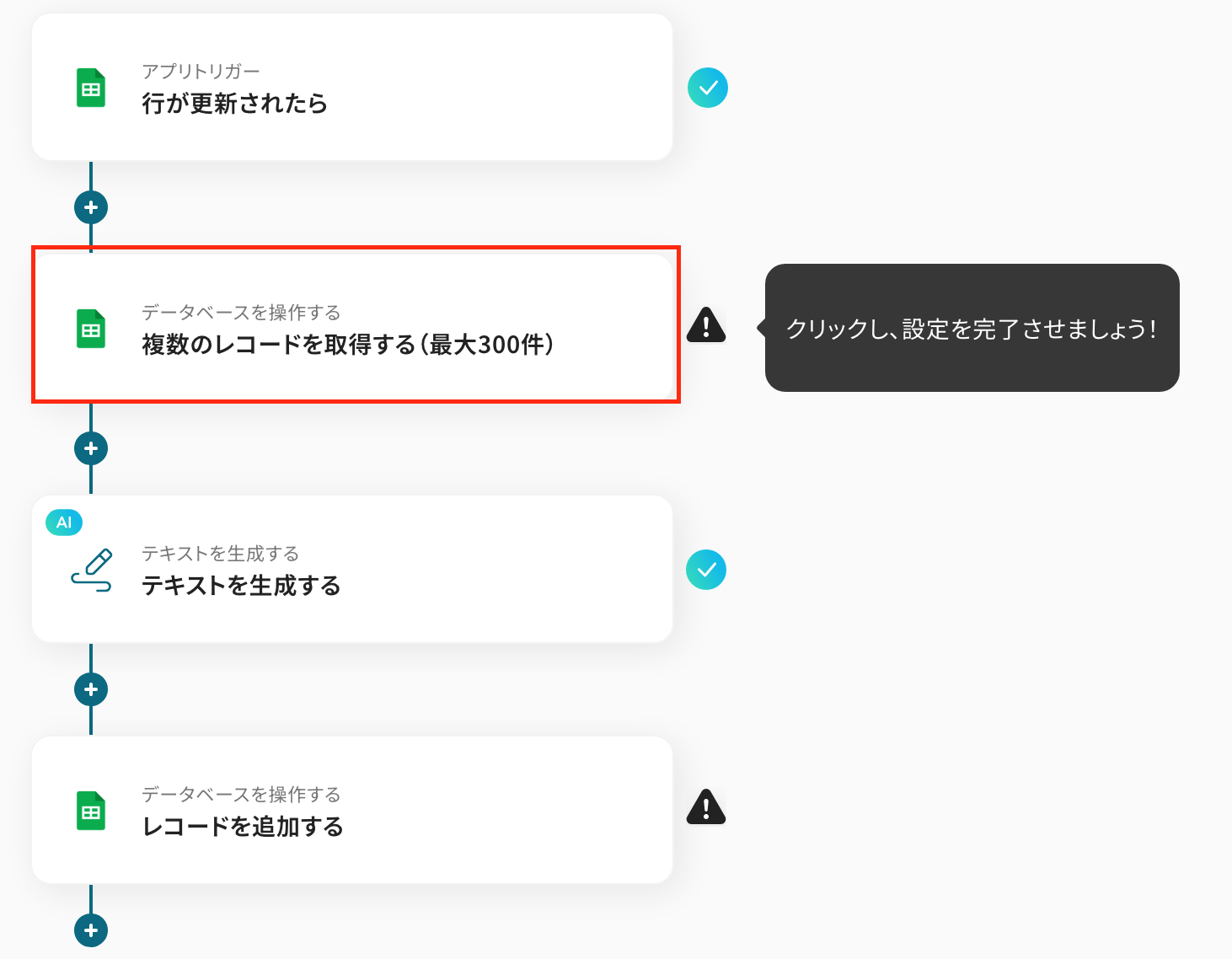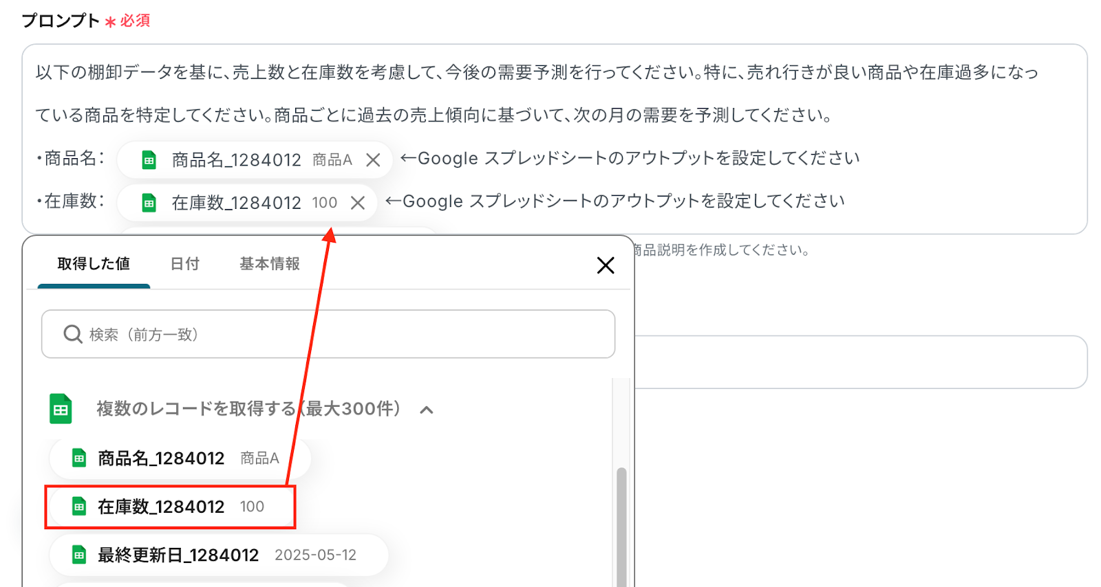 以下の赤枠をクリックしてください。 ここでは、次ステップのAIによる棚卸データ分析を行うために、Googleスプレッドシートから複数のレコードを取得します。