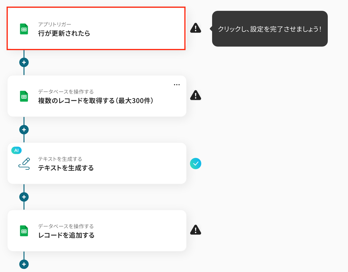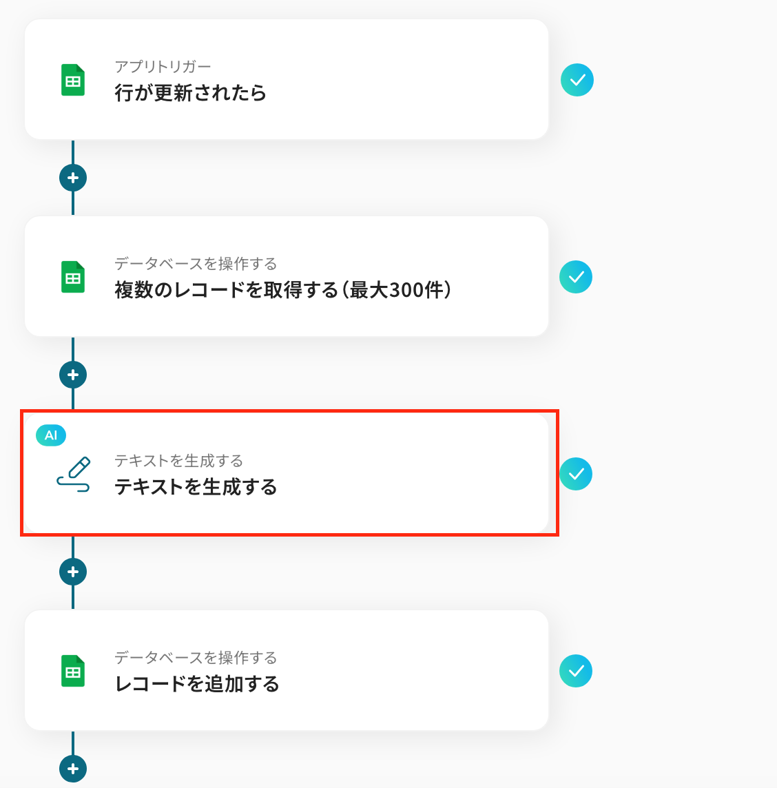 トリガーの設定とAIによるテキスト生成の設定とGoogleスプレッドシートのアクション設定