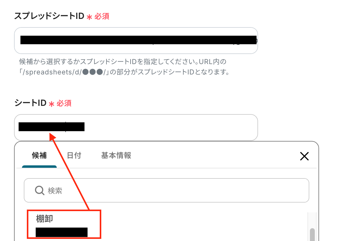 スプレッドシートIDとシートIDは、入力欄をクリックして表示される「候補」から選択してください。