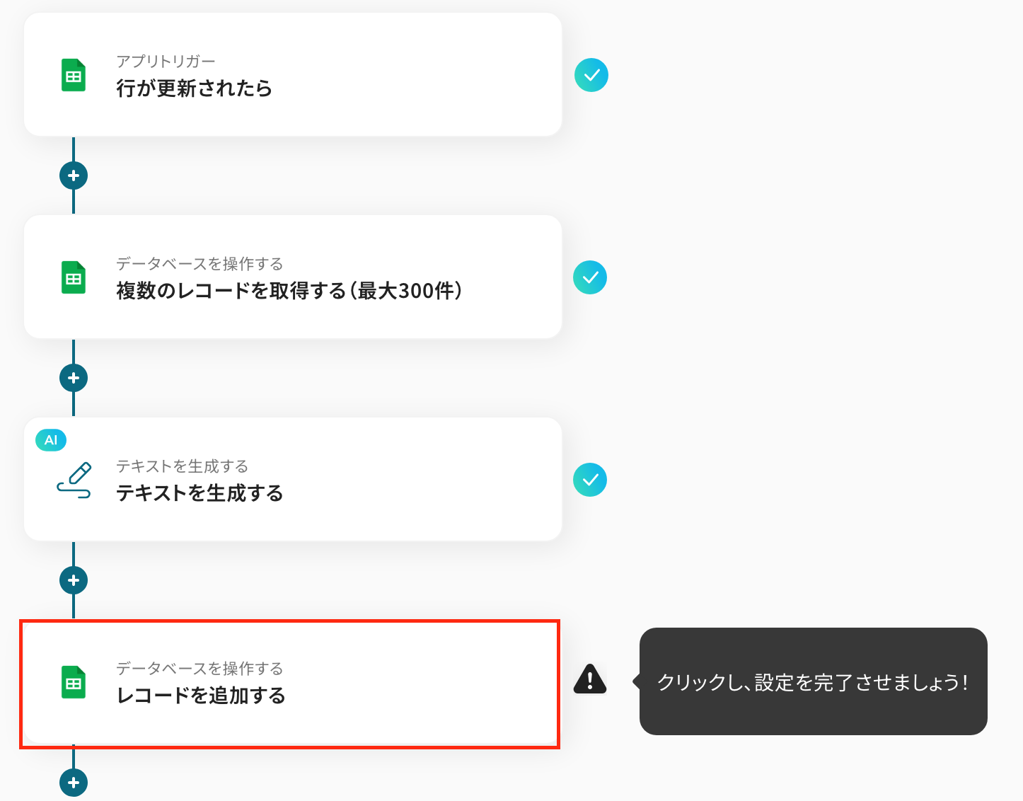 いよいよ、最後の設定です!以下の赤枠をクリックしましょう。 この工程では、前の工程で取得した値を用いて別のシートへ情報を追加していく設定を行います。