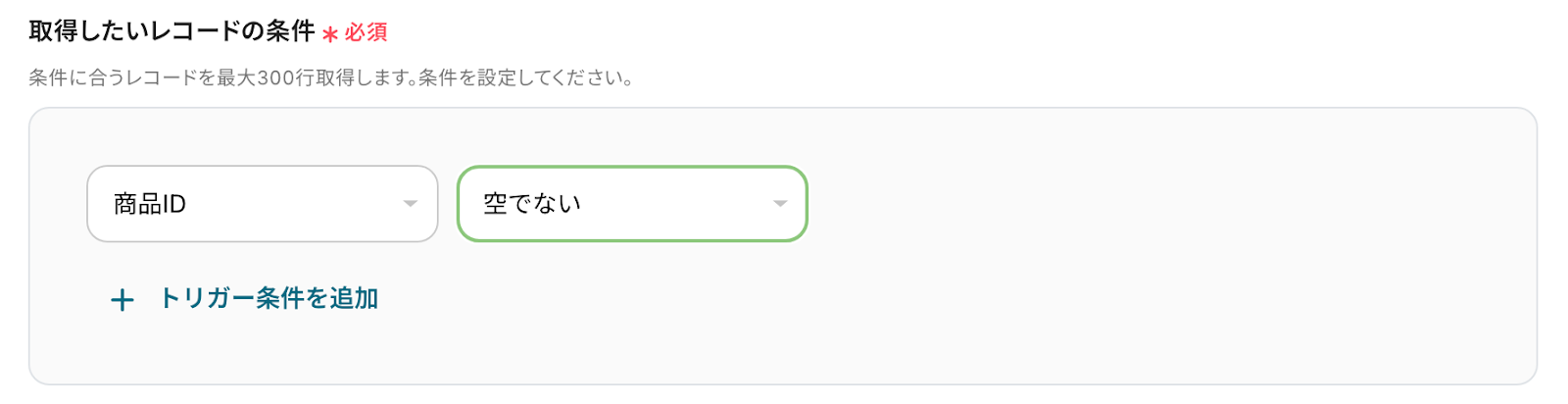 次に進むと、「取得したいレコードの条件」を設定する画面に遷移します。 ここでは、指定したGoogleスプレッドシートからアウトプットを抽出する設定を行います。 サンプルシートの場合は、「商品ID」が「空でない」と設定します。以下のように設定することで、商品IDが空になっていない複数のレコードを取得することができます。