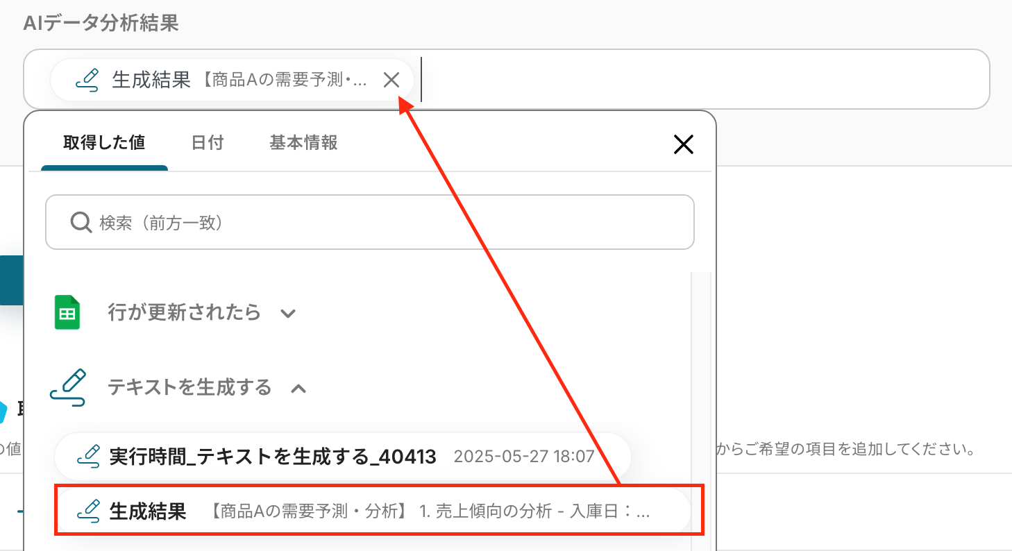 「AIデータ分析結果」の項目には、テキスト生成の設定で取得したアウトプットを設定しましょう。