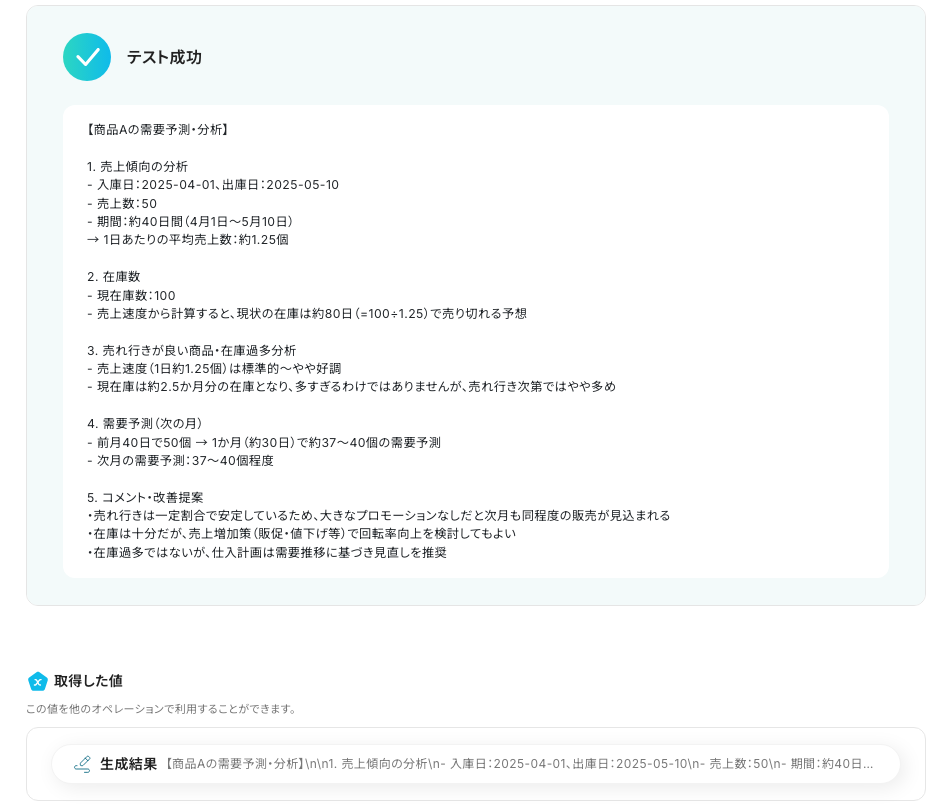 設定ができたら、「テスト」をクリックします。 テストが成功し、AIが棚卸データを分析してくれました。