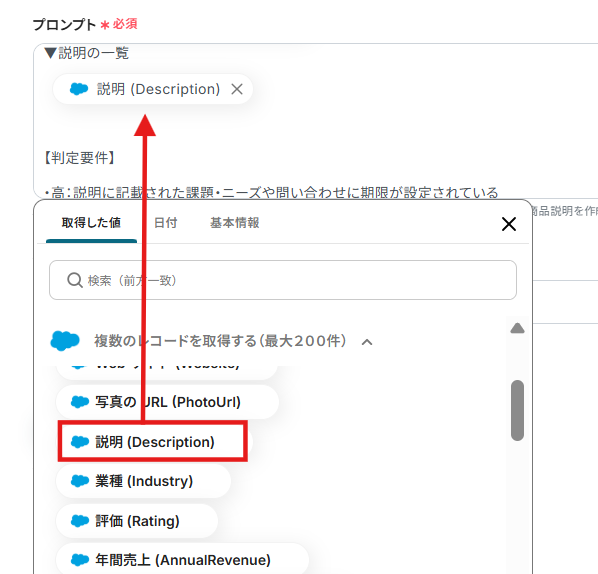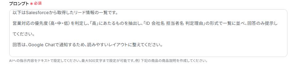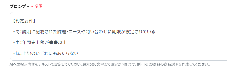 - AI機能の「テキストを生成する」アクションの設定では、どのような観点で課題点を抽出するか、どのような形式で出力させたいかなど、プロンプトの内容を固定値やそれまでのオペレーションで取得したアウトプット情報を活用して具体的に指示することで、分析の精度を高めることができます。