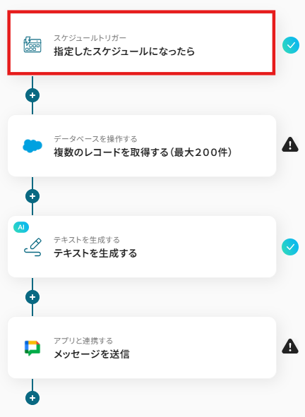 それではここから代表的な例として、指定のスケジュールになったら、Salesforceで特定条件のリード情報を取得し、AIで分析してその結果をGoogle Chatに通知するフローを解説していきます!