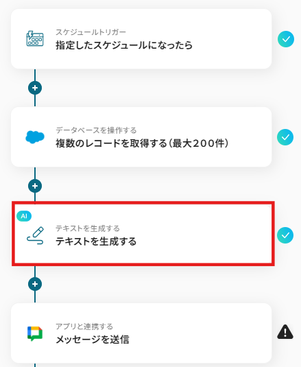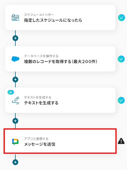 指定のスケジュールになったら、Salesforceで特定条件のリード情報を取得し、AIで分析してGoogle Chatに通知する