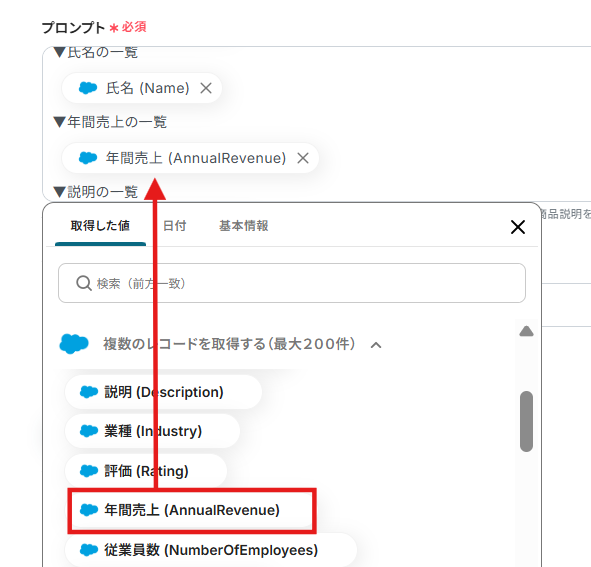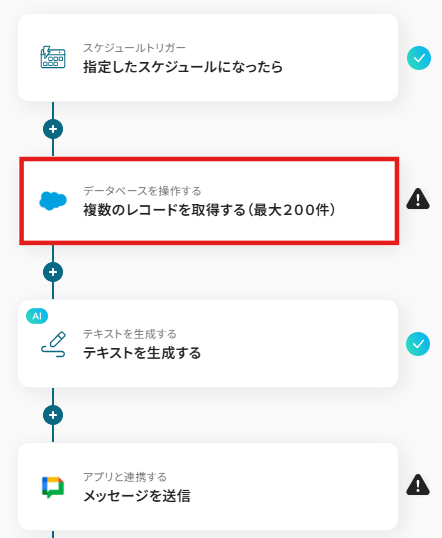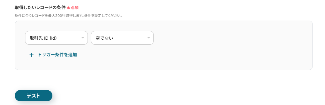 - Salesforceの「複数のレコードを取得する(最大200件)」アクションの設定では、取得対象とする商談の条件(例えば、特定のフェーズにある商談や特定の期間に作成された商談など)を細かく指定することが可能です。