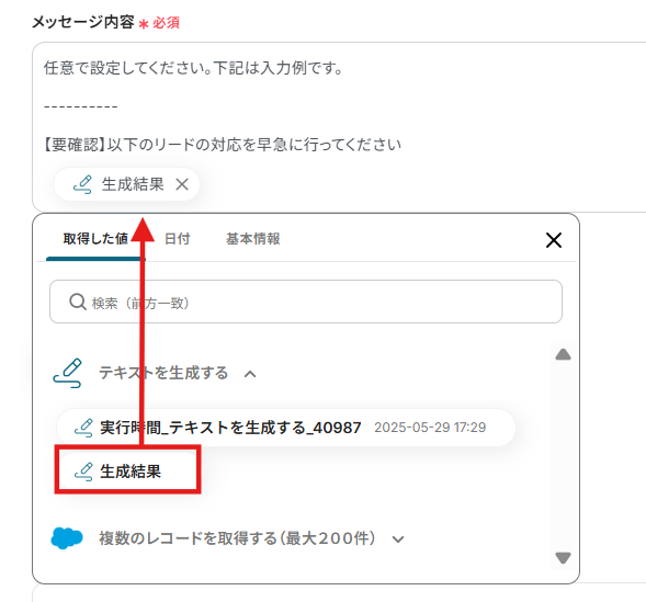 - 続いて、オペレーションでテキスト生成機能を選択し、「テキストを生成する」アクションを設定します。Salesforceから取得したリード情報を元に、AIが分析コメントなどを生成します。