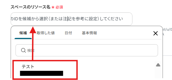 3.スペースのリソース名(通知されるチャット)を選択します。クリックすると下に候補が表示されます。