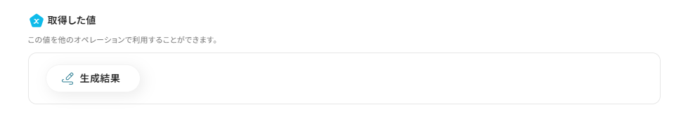 - 最後に、オペレーションでGoogle スプレッドシートの「レコードを追加する」アクションを設定し、AIによって生成されたテキストを指定のスプレッドシートに追加します。