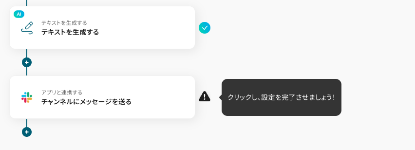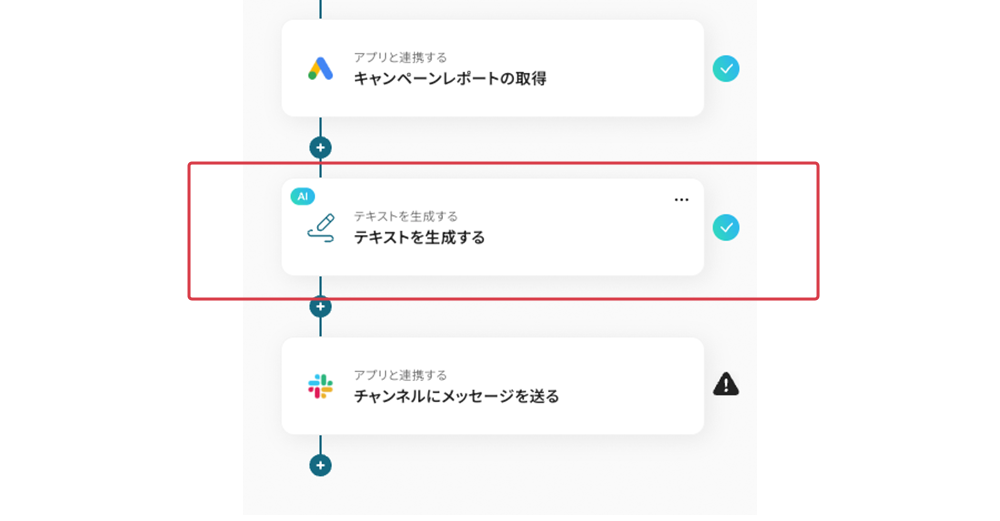 テンプレートの3つ目の工程をクリックします。この工程は前の工程で取得した値を使って、Slackへの投稿用テキストをAIで生成する設定を行います。設定済みの証(水色のアイコン)が点灯していますが、追加設定のため開きます。