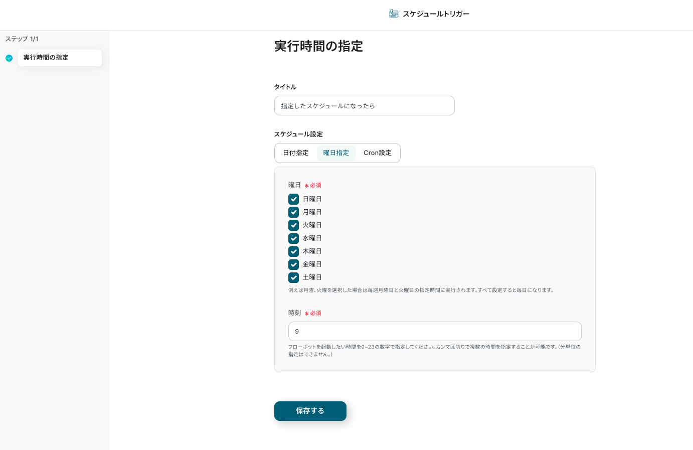 設定のすぐ下にあるタブ(日付指定・曜日指定・Cron設定)の切り替えと、各設定でフローのタイミングと頻度をカスタマイズできます。