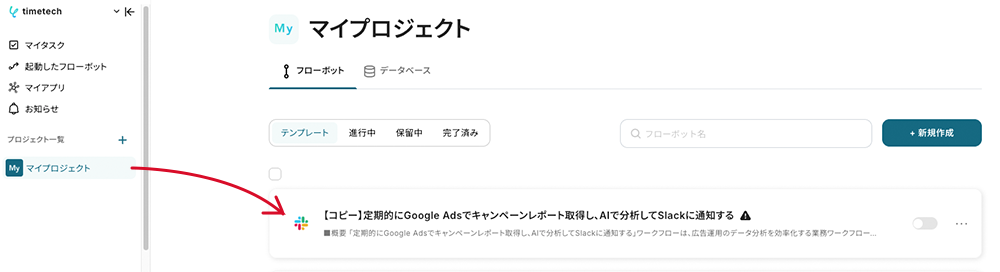 コピーしたテンプレートは、マイプロジェクトに追加されます。マイプロジェクトは左のメニューバーからアクセス可能です。