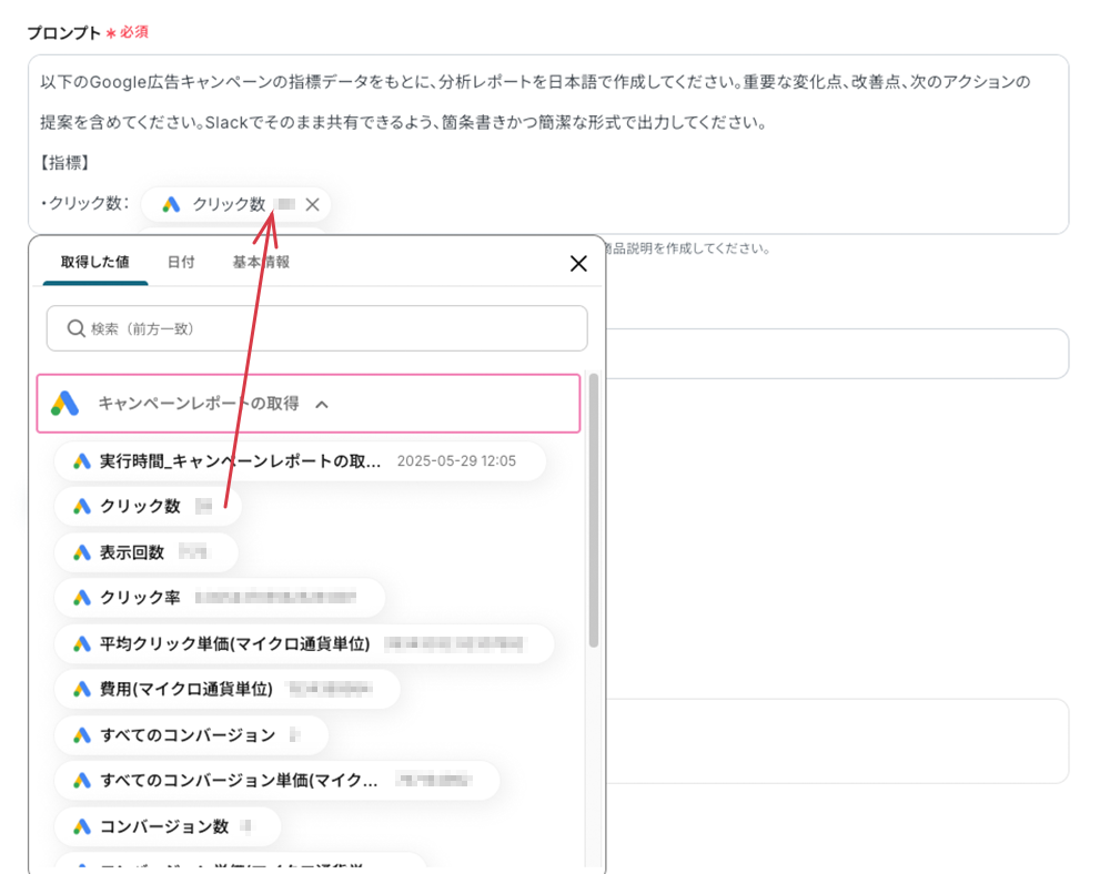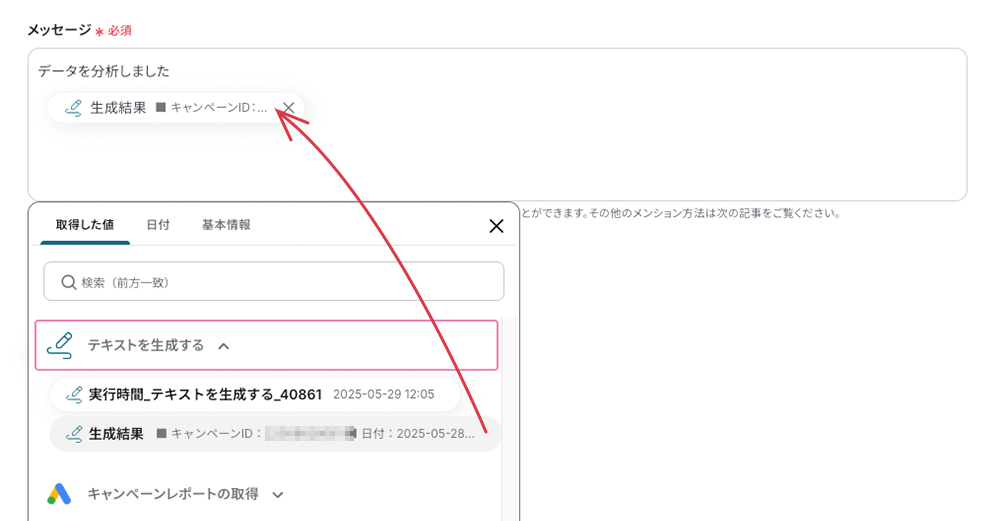 {}の部分には、前の工程で取得した値の引用コードを埋め込みます。フィールドをクリックしてプルダウンメニュー内から選択可能です。