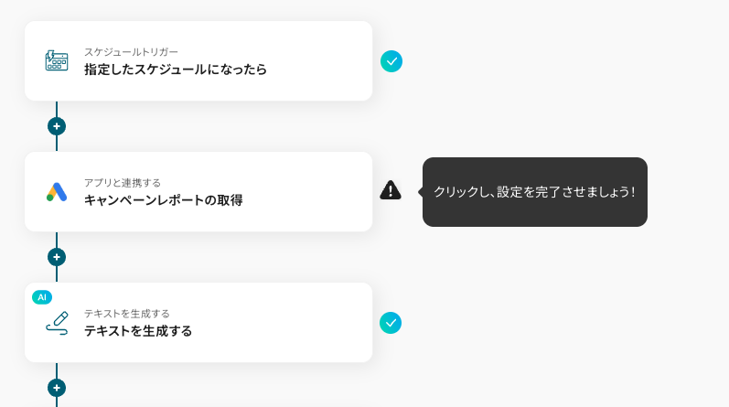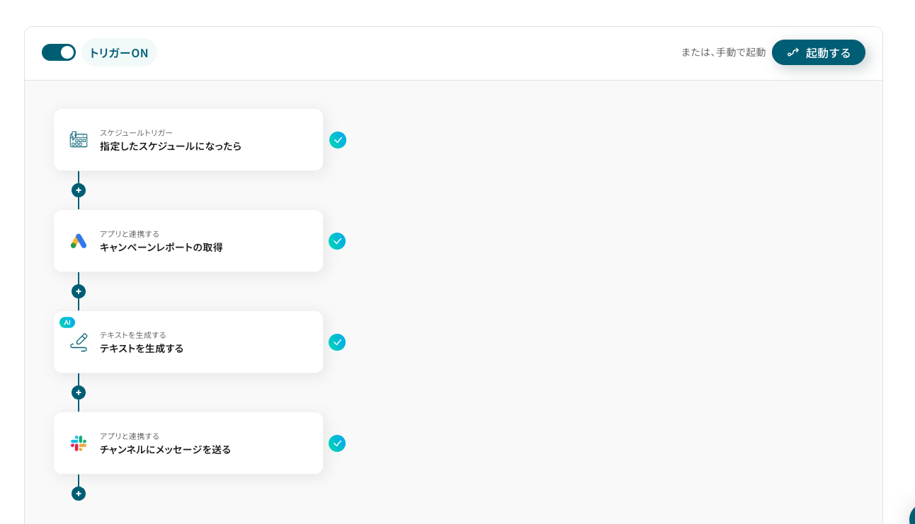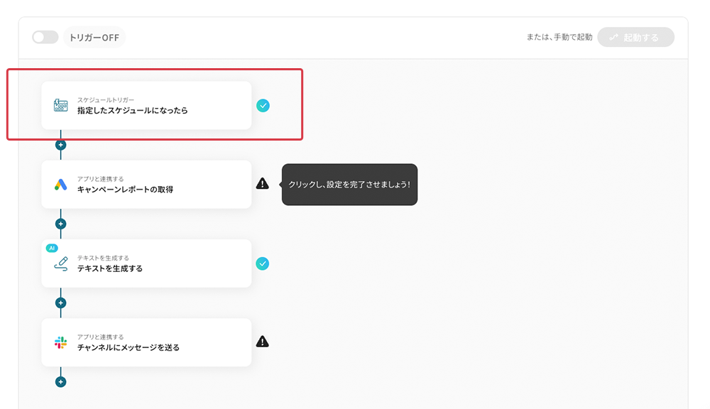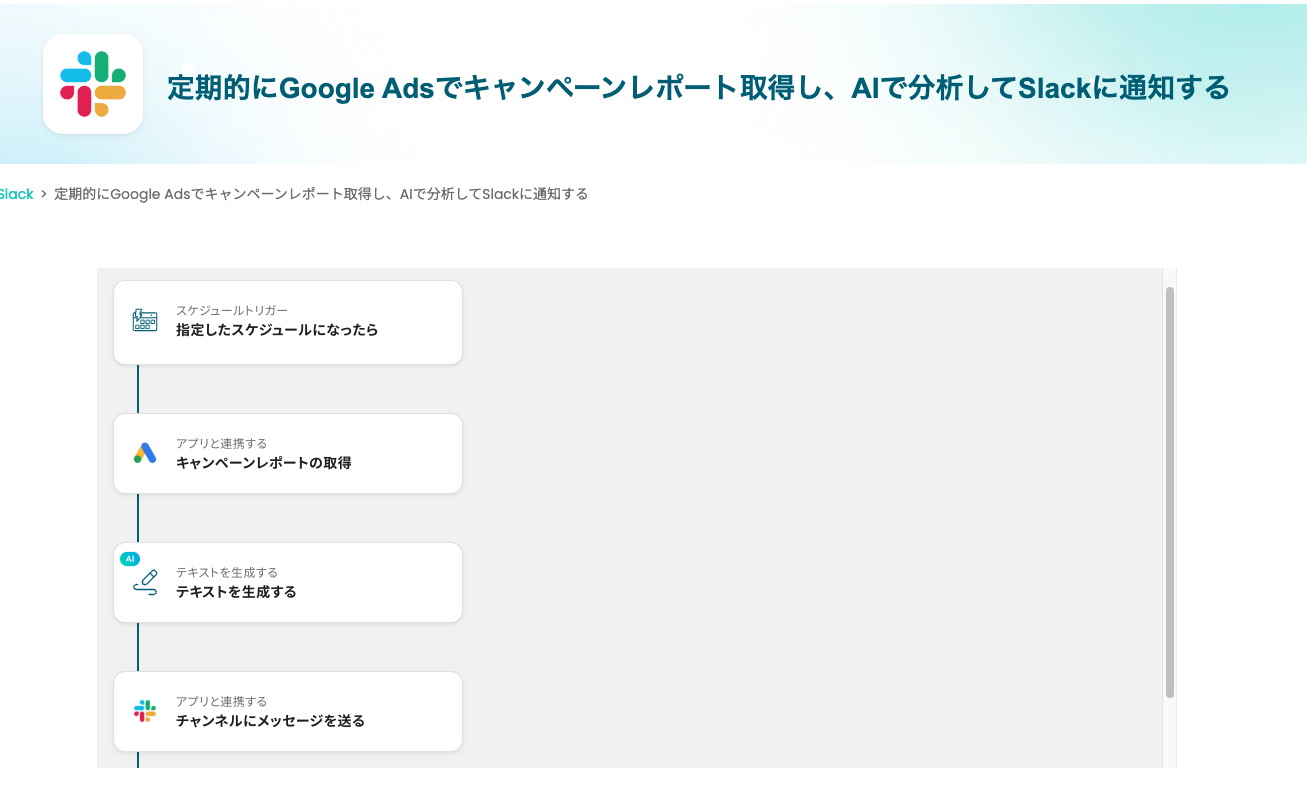 それではここから代表的な例として、定期的にGoogle Adsからキャンペーンレポートを取得し、AIで分析してその結果をSlackに通知するフローを解説していきます!