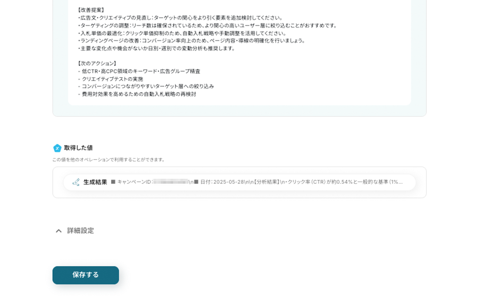 次に、「注目すべき変化」や「改善提案」といった具体的な出力項目を明示的に指示することで、AIは実務的で価値のあるコメントを生成しやすくなります。広告パフォーマンスの分析では、ただの数値の羅列ではなく、「何が起きたのか」「何をすべきか」が明確であることが重要です。