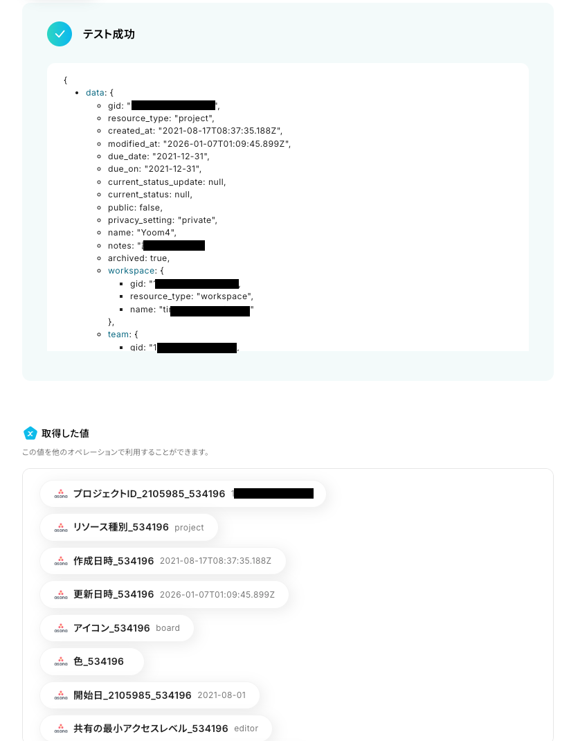- Asanaのトリガー設定では、対象としたいワークスペースIDおよびプロジェクトIDを任意の値で設定してください。