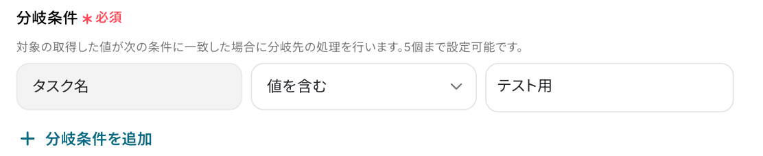 「担当者が〇〇で、タスク名に△△が含まれている場合」などの条件で分岐させることも可能です。