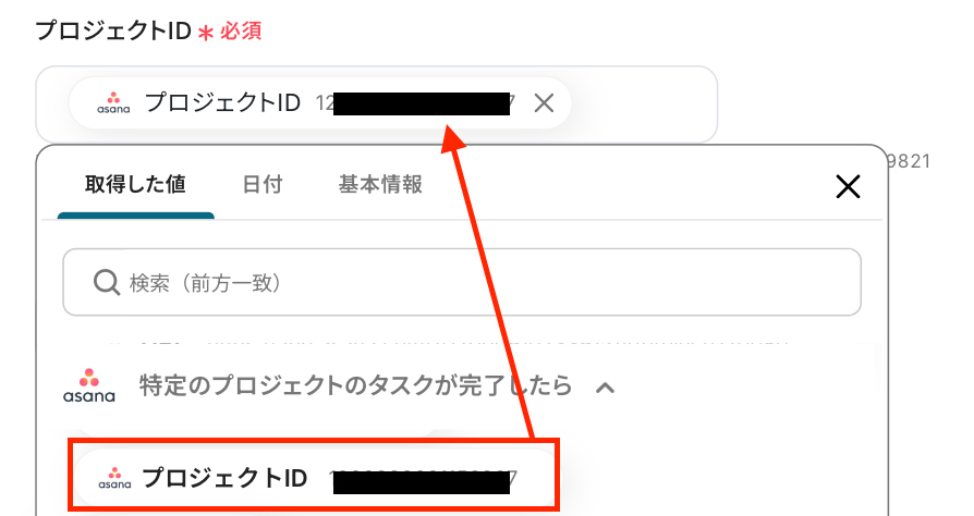 - 次に、オペレーションでAsanaの「タスクを検索」アクションを設定し、完了したタスクの詳細情報を取得します