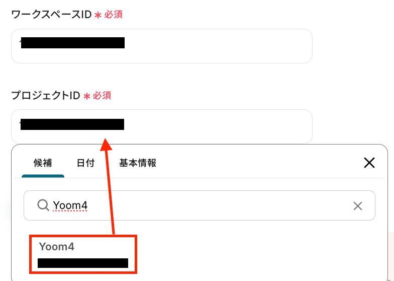 「ワークスペースID」と「プロジェクトID」は、以下の画像のように入力欄をクリックすると候補が出てくるので該当するものをクリックしましょう。