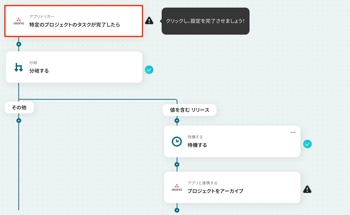 最初の設定です!ここから「Asanaの特定タスク完了後、指定日数が経過したら対象プロジェクトを自動でアーカイブする」フローを設定していきます。