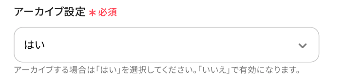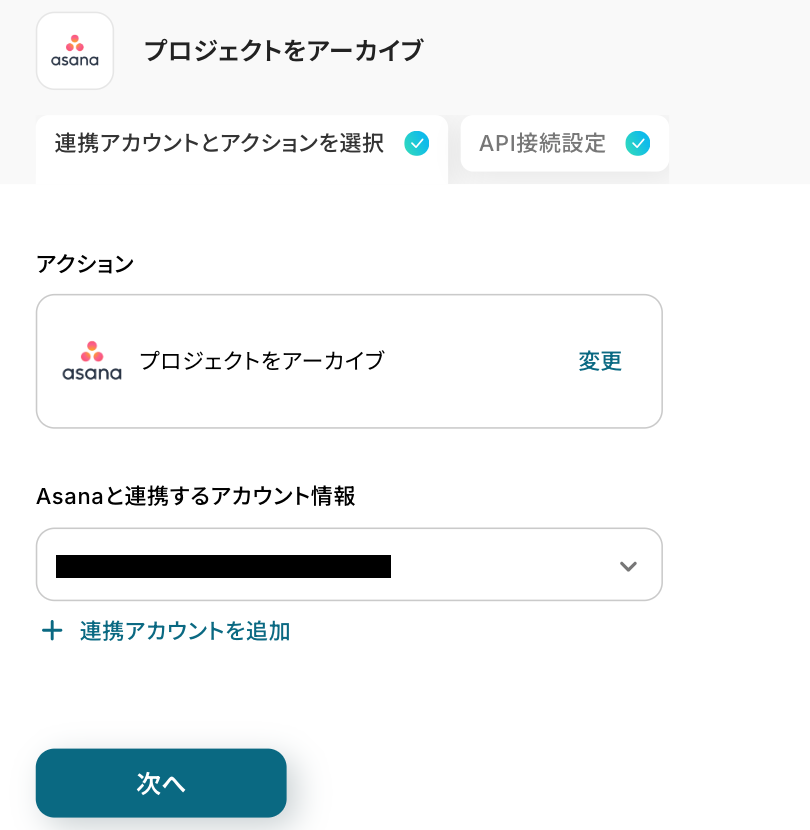 - 最後に、オペレーションでAsanaの「プロジェクトをアーカイブ」アクションを設定し、対象のプロジェクトをアーカイブします。
