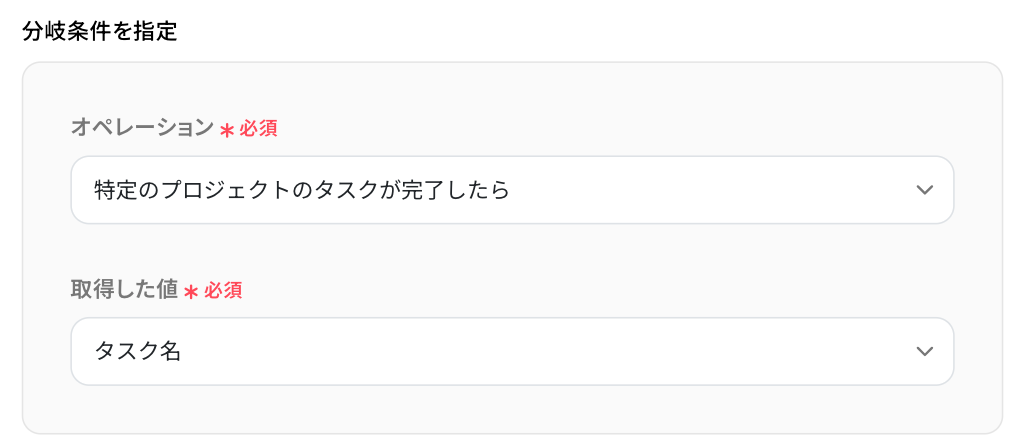 - 分岐条件では、どのようなタスクが追加された際にGoogleドキュメントへ追記処理を行うか、担当者やタスクのセクション、タグなどの情報をもとに任意で設定してください