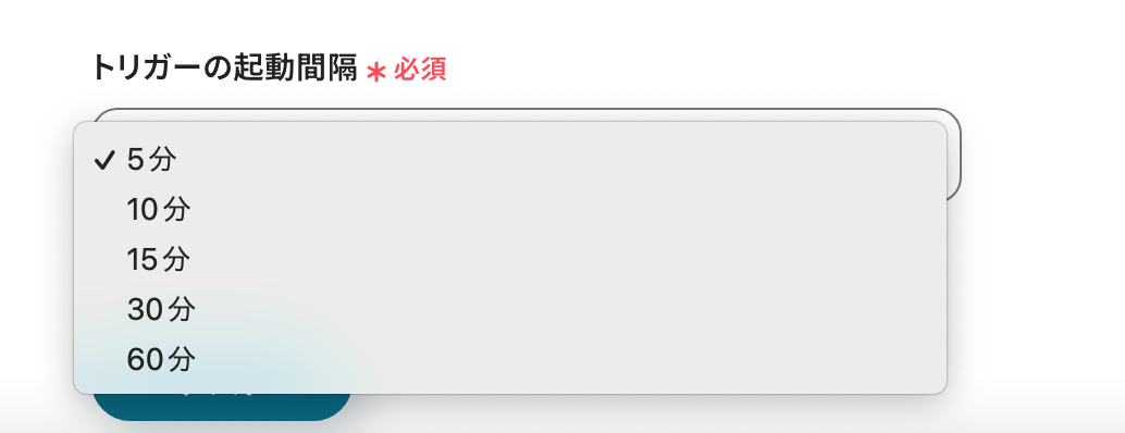 トリガーの起動間隔は、5分・10分・15分・30分・60分から選べます。
