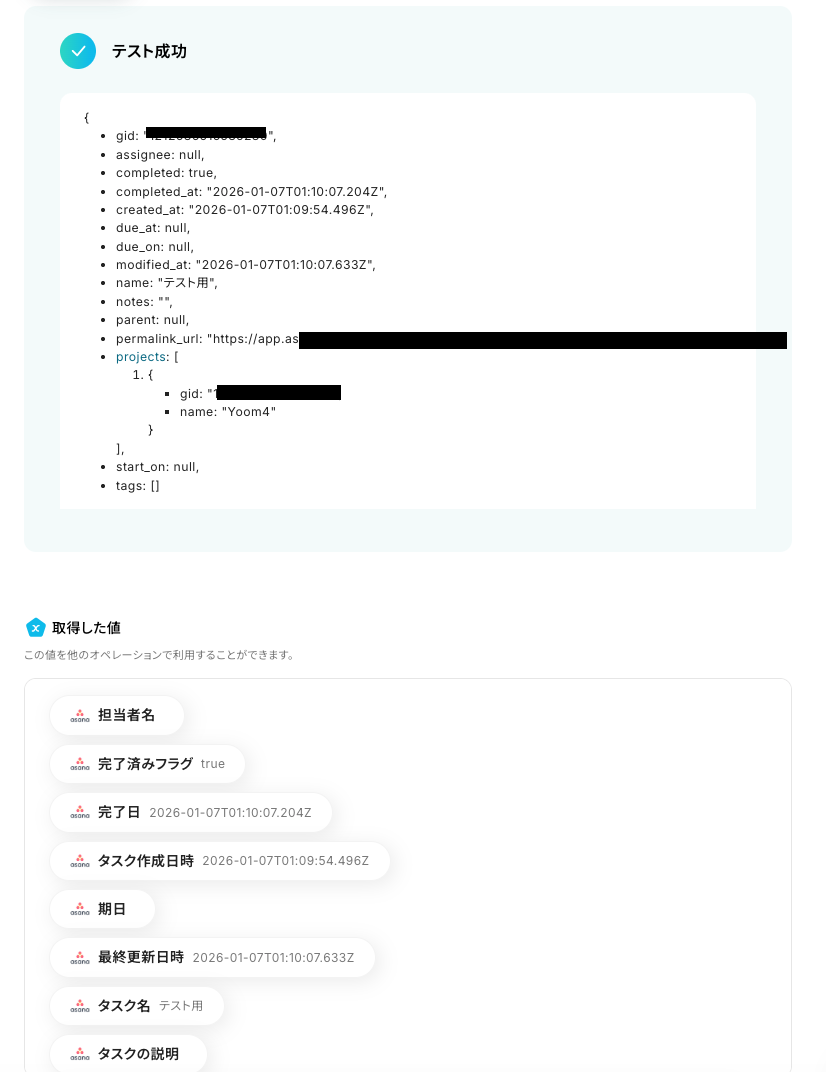 - 更新する項目には、Asanaから取得したタスク名や完了日などの動的な情報を変数として設定したり、「完了」などの固定値を入力したりと、自由にカスタマイズが可能です