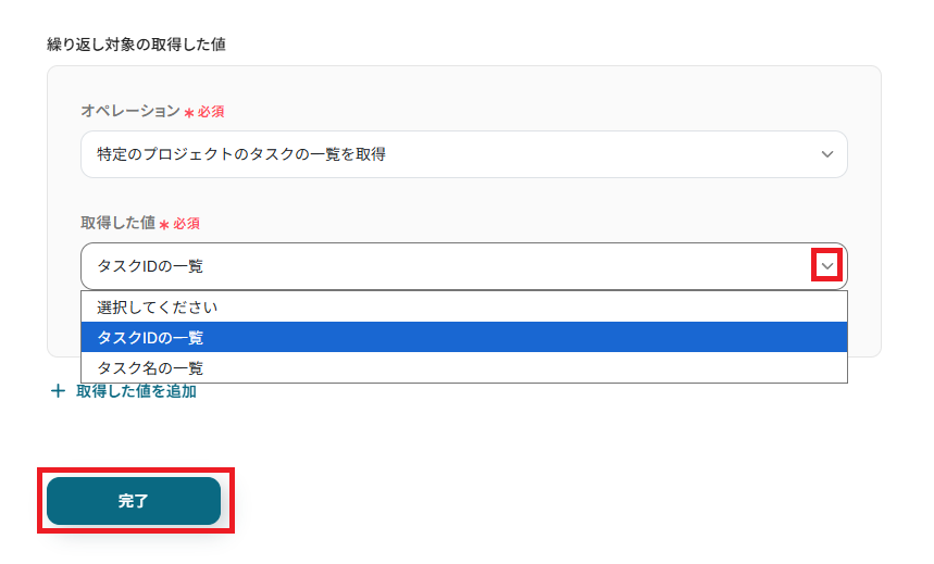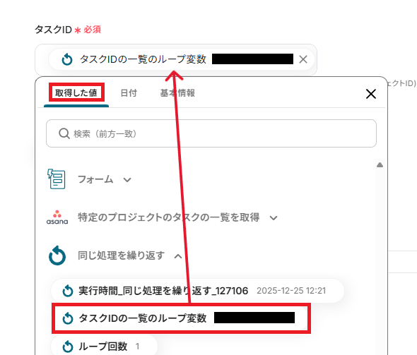 「取得した値」には、ループ処理で用いる値(タスクIDの一覧)を選択しましょう。