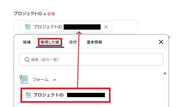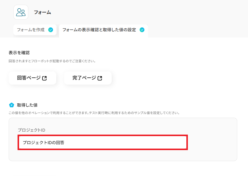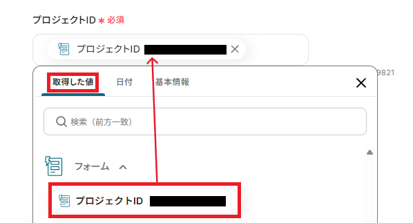 「プロジェクトID」は、取得した値からフォームの回答を引用し設定しましょう。