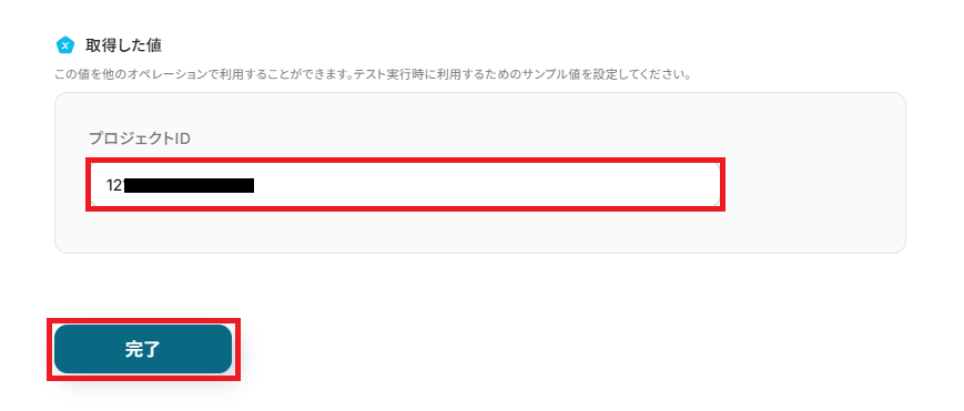 取得した値に入力したら「完了」を押して次へ進みましょう。