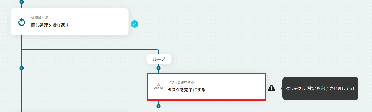 - 次に、ループ機能を設定し、前段で取得したタスク情報をもとに、個別のタスクに対して完了処理を繰り返すように設定します。